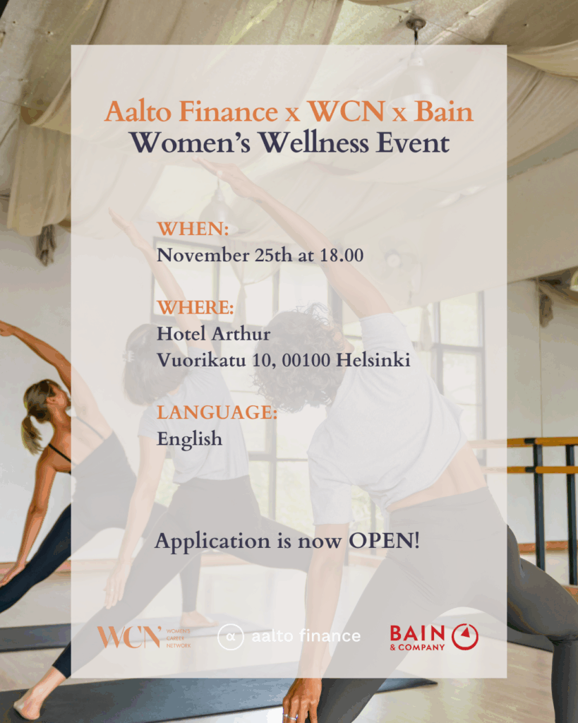 Looking to recharge and expand your network? You are warmly invited to Aalto Finance’s first-ever Women’s Wellness Event, created together with Women’s Career Network and Bain. This is an easygoing event for those who identify as women in business, tech, and law who want to explore what a career in consulting can look like.
